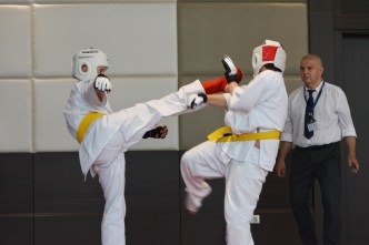 Copiii nu fac kumite (luptă) decât după ce au deprins un minim tehnico-tactic și au o oarecare capacitate de defensivă deja dezvoltată. Chiar și atunci când încep practicarea kumite-ului, lupta se desfășoară în condiții de maximă siguranță pentru aceștia și cu echipament de protecție complet: protecții tibie, mănuși și căști.